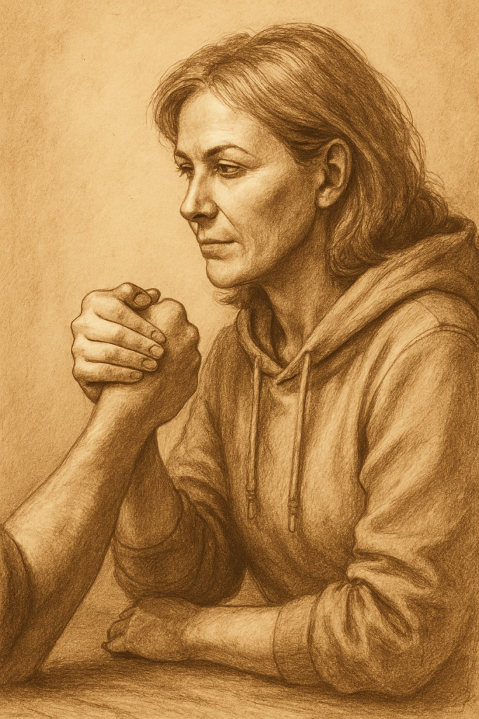Ein schwaches Lächeln huschte über sein Gesicht, doch in seinen Augen lag Leere. Die Mutter kicherte leise, schüttelte den Kopf und stellte die Tasse ab. „Weißt du was? Eigentlich hätte ich auch mal Lust, das auszuprobieren.“ Sie rieb sich spielerisch die Hände. „Komm, nur zum Spaß. Einmal Armdrücken, Mann gegen Frau.“
